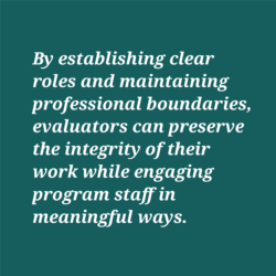 Evaluators must maintain objectivity and independence throughout the partnership-building process to ensure that findings are credible, unbiased, and useful. By establishing clear roles and maintaining professional boundaries, evaluators can preserve the integrity of their work while engaging program staff in meaningful ways. In other words, strong partnerships do not compromise an evaluator’s impartiality; rather, they foster mutual respect, transparent communication, and a shared commitment to improvement among everyone involved.